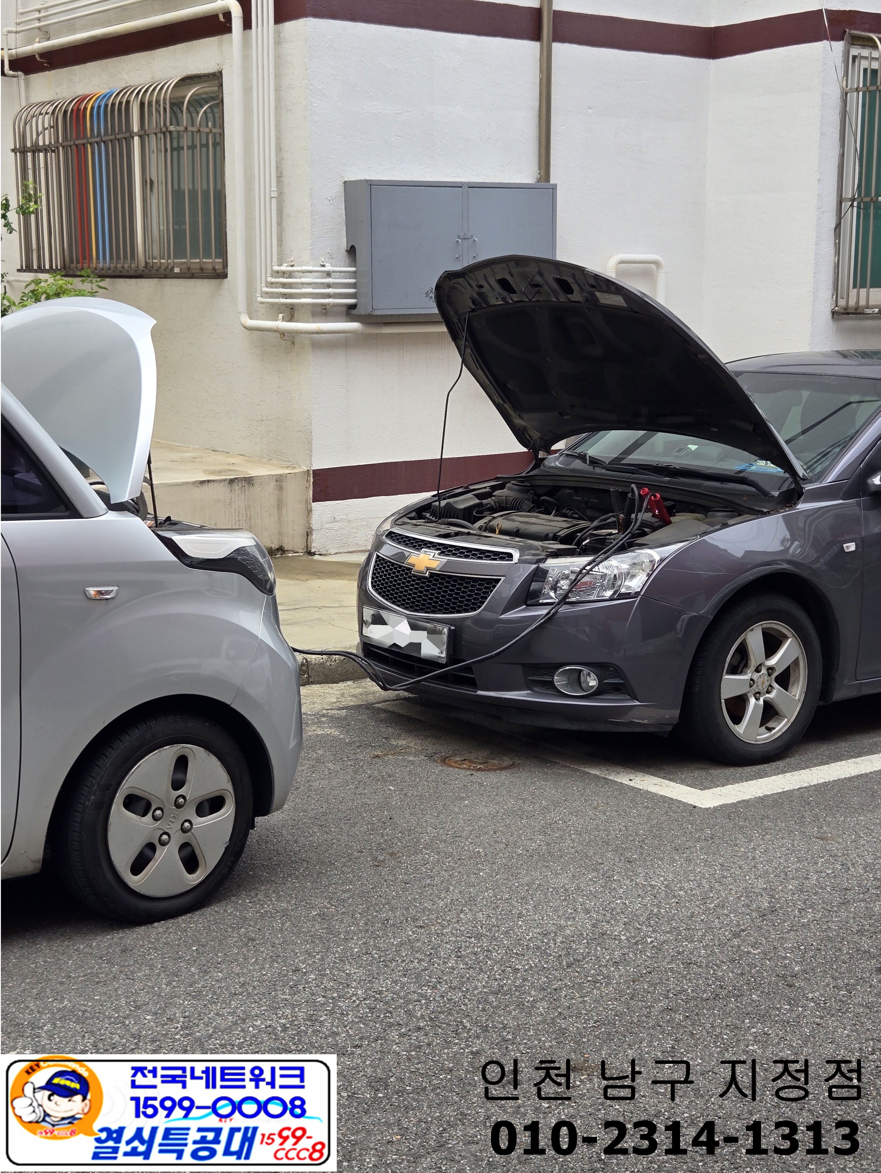 방전된차량을 점프하고 작업을 진행합니다