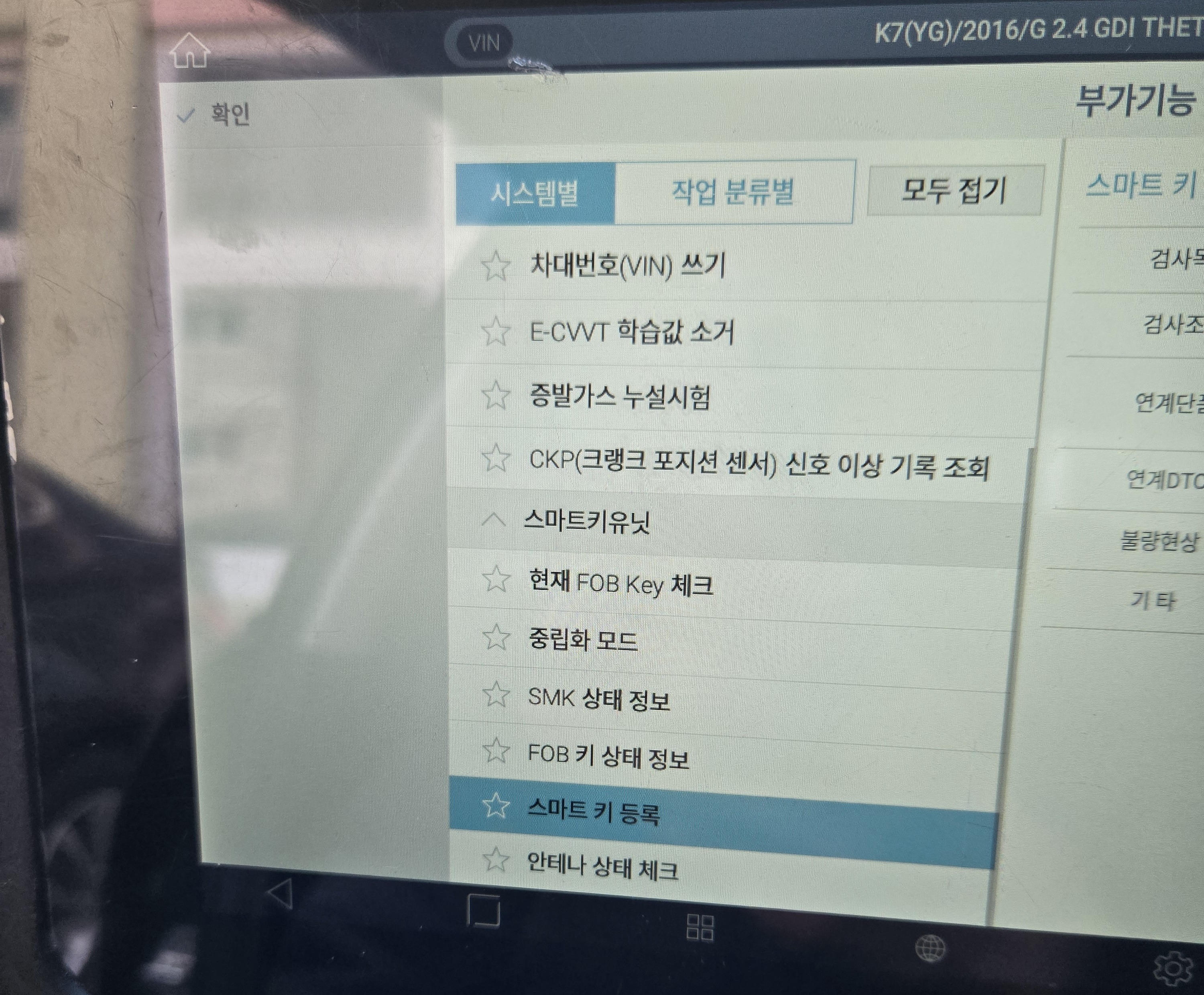 전용진단기를 차량에 연결하고 차종 연식등을 차례로 찾아들어갑니다