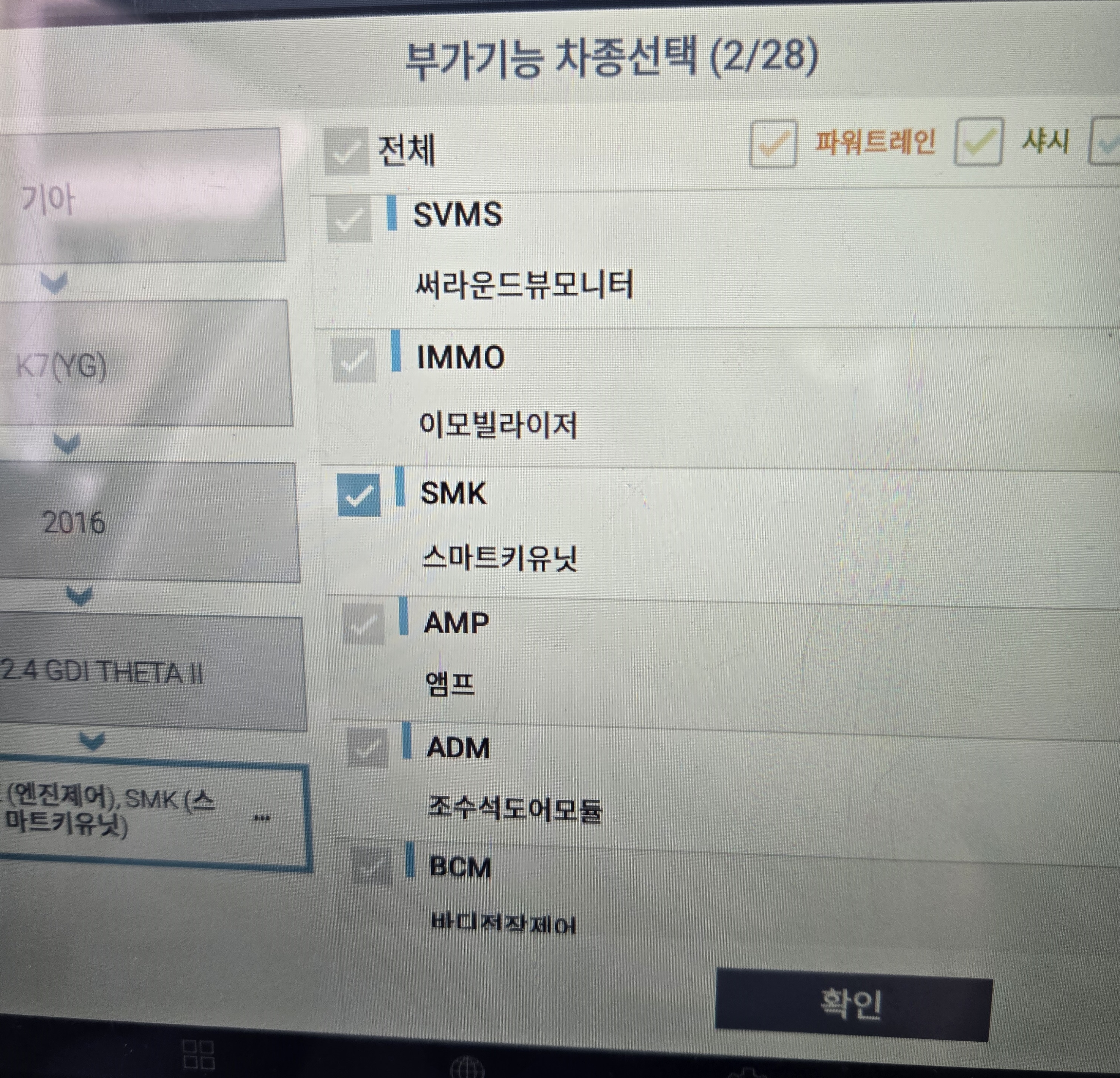 전용진단기를 차량에 연결하고 차종 연식등을 차례로 찾아들어갑니다