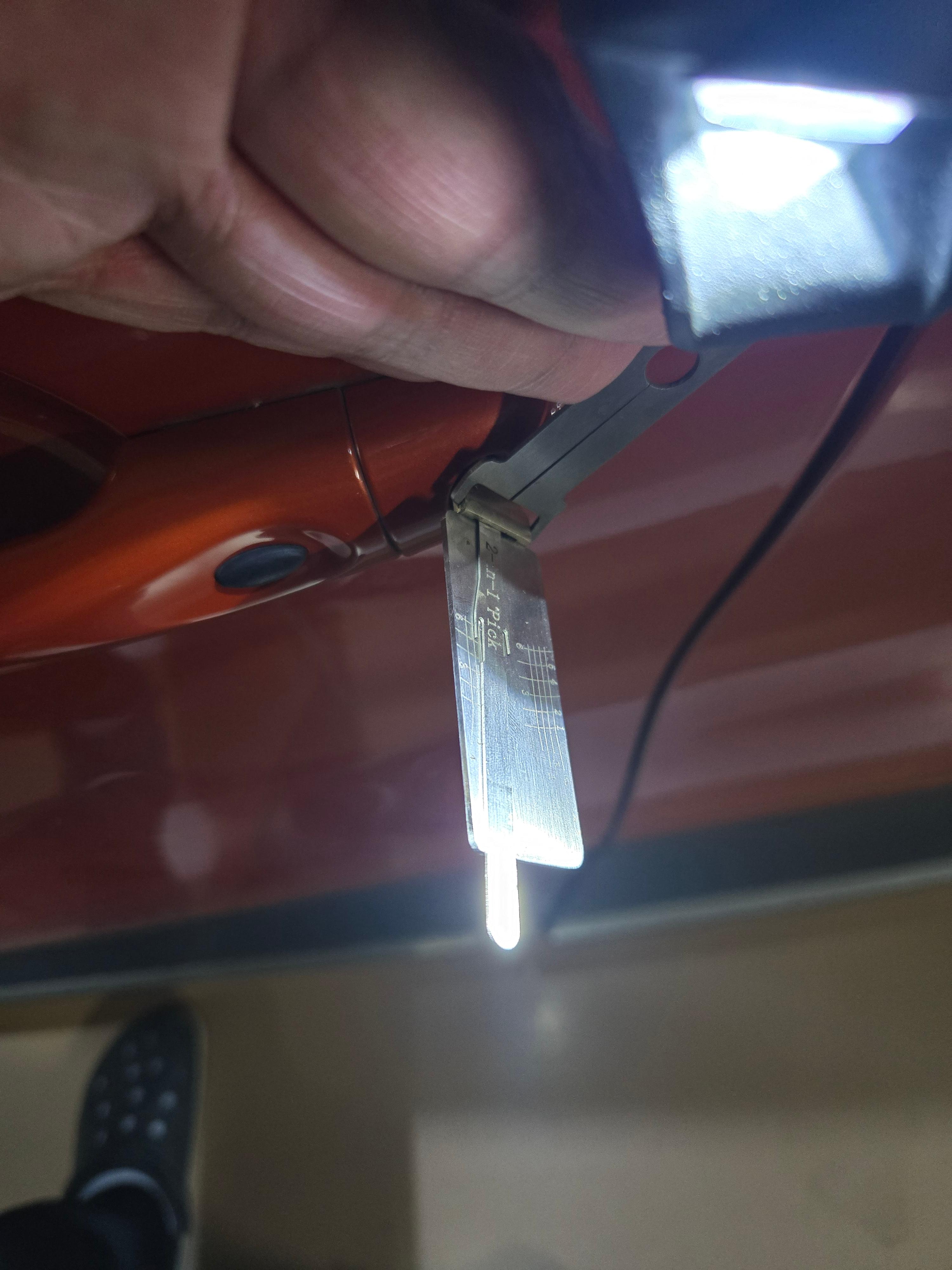 전용공구를 운전석 키홀에 삽입하고 개문작업을 시작합니다